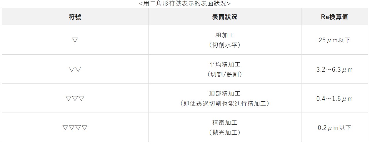 ▽的數字表示表面粗糙度。由於可以直觀地理解,因此通常仍將其用作圖表。另外,由於一目了然,所以如果表面狀態不需要非常精確,則特別容易理解。它是根據1952年的JIS標準制定的。