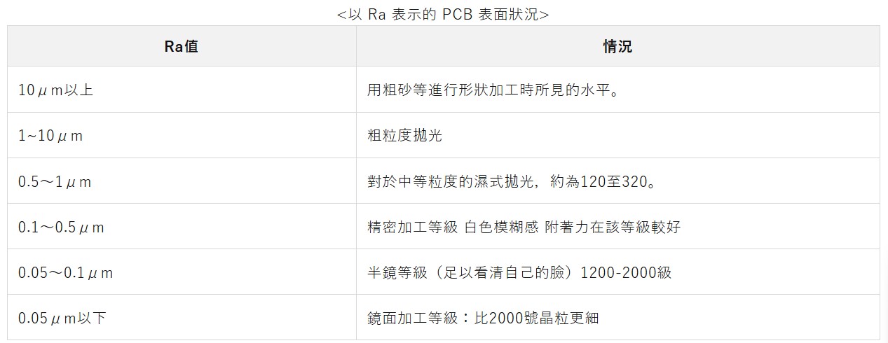 是假設表面上的所有凹凸不平均為凸面的簡單平均值。這是目前最常用的參數。在我看來,與PCB相關的事情如下表所示。